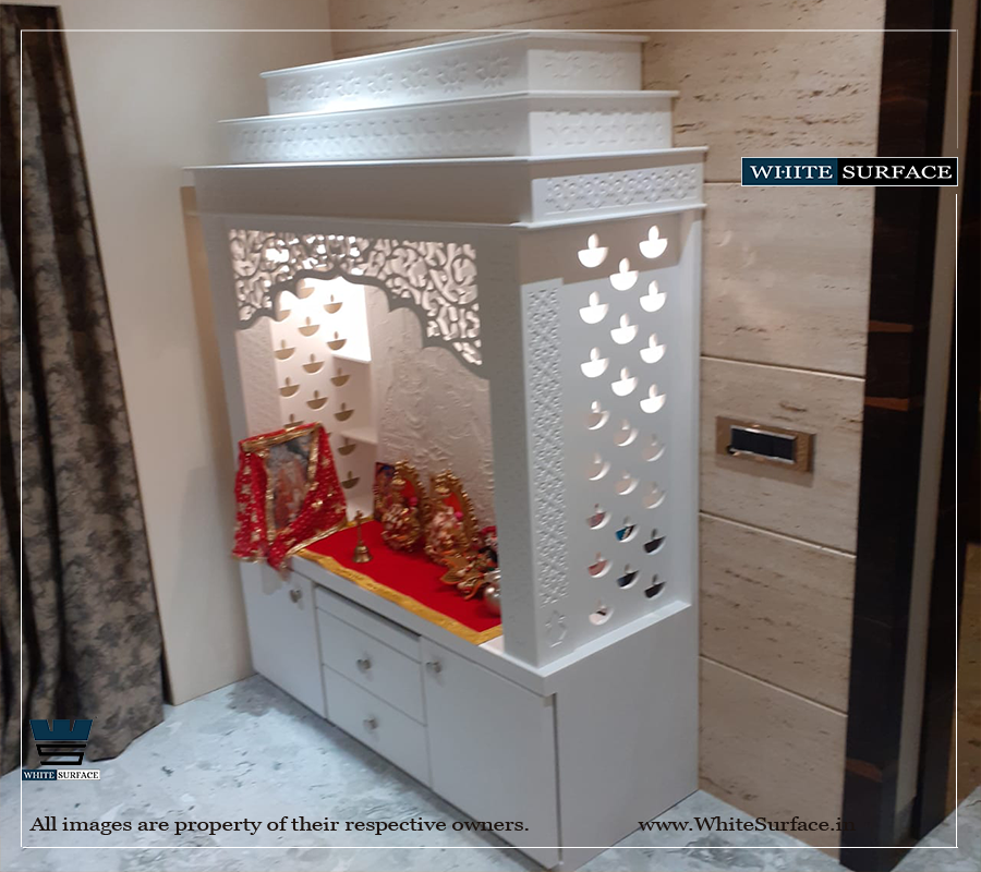 White Surface is widely known for its Solid Surface aka Corean Mandir customising & manufacturing work. Our mandirs consist of modern as well as traditional designs with various other features, including lighting, bells, carved God images(in single as well as colour), waterproof, heat resistance from burning items at the temple(diya, camphor, etc) and